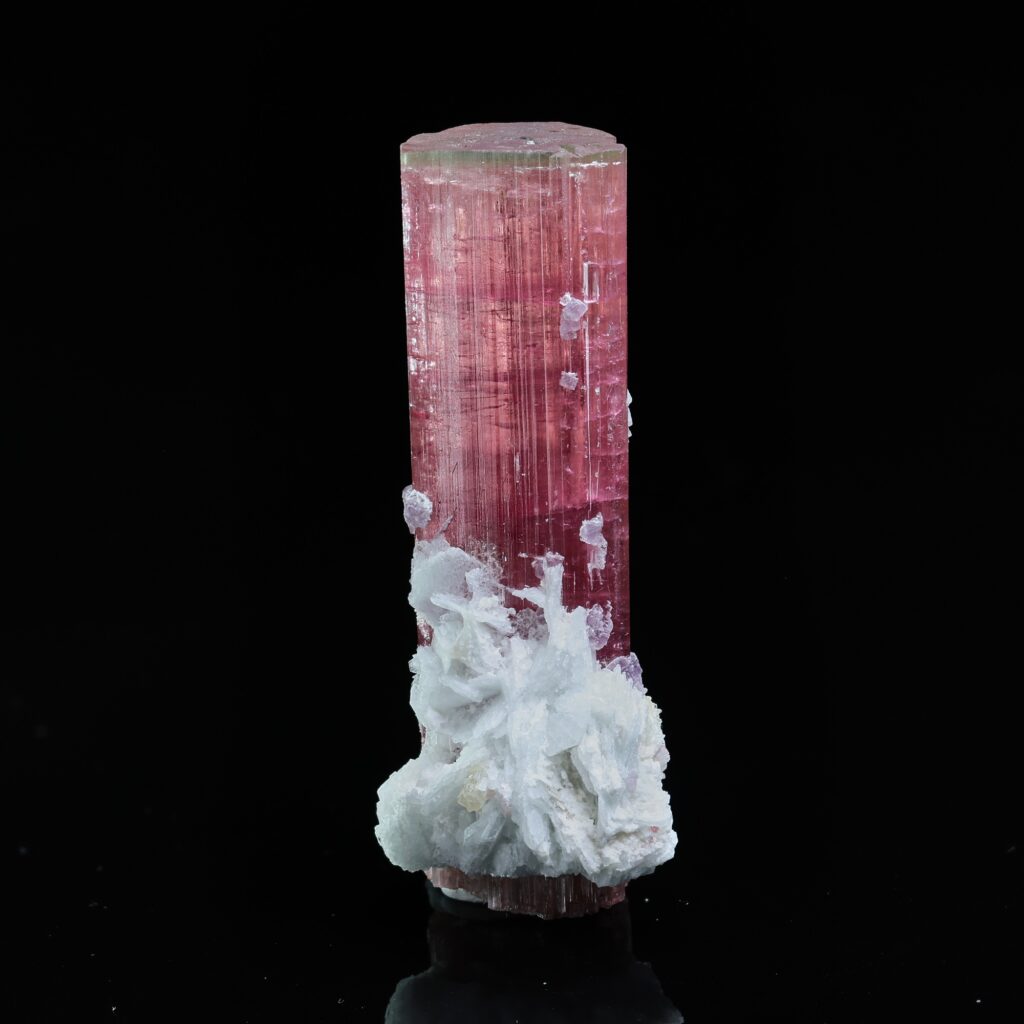 Transparent, multi coloured tourmaline crystal with a black top