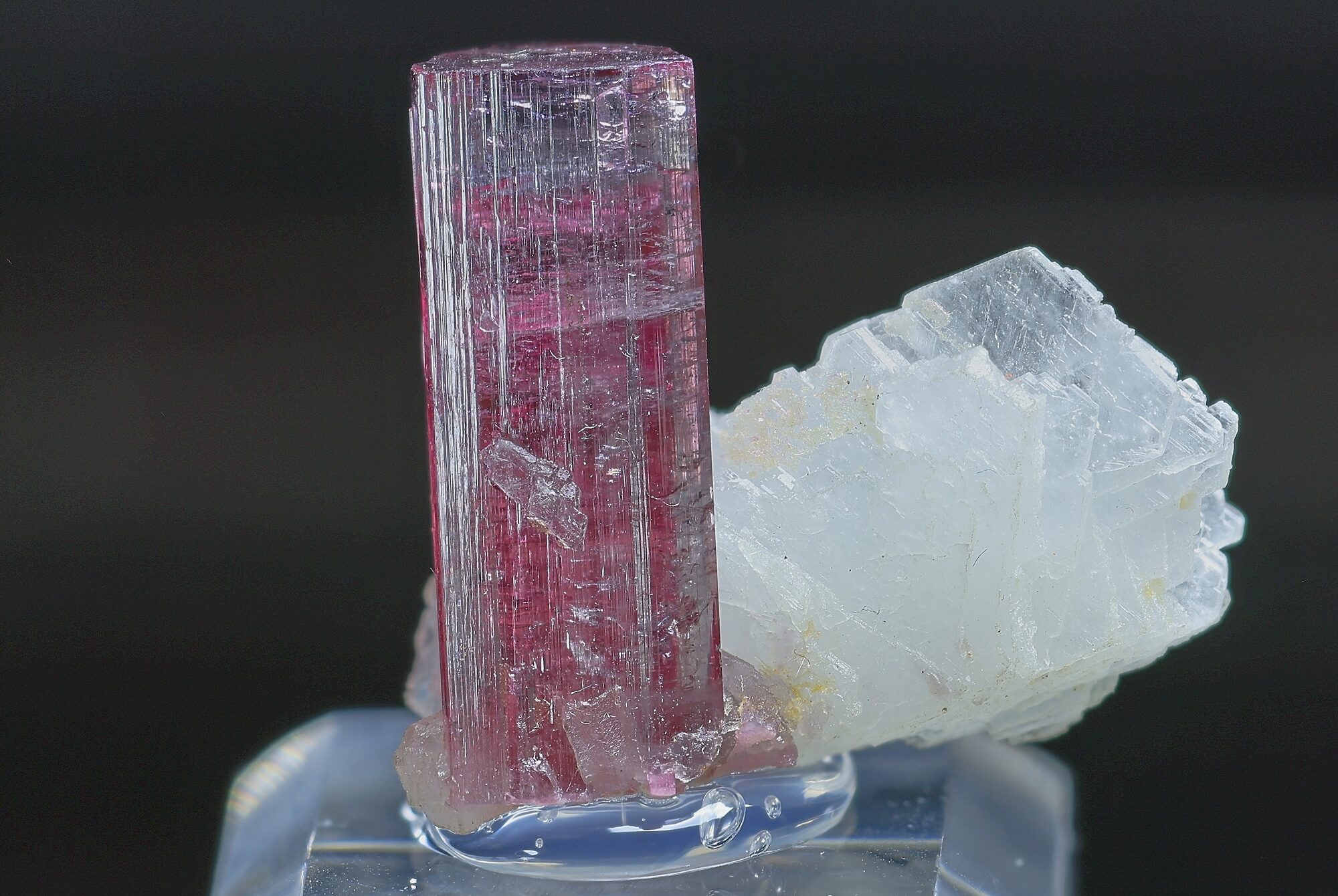 Grüner Turmalin mit hell violetten Lepidolit Kristallen. Der Kristall ist einmal repariert.