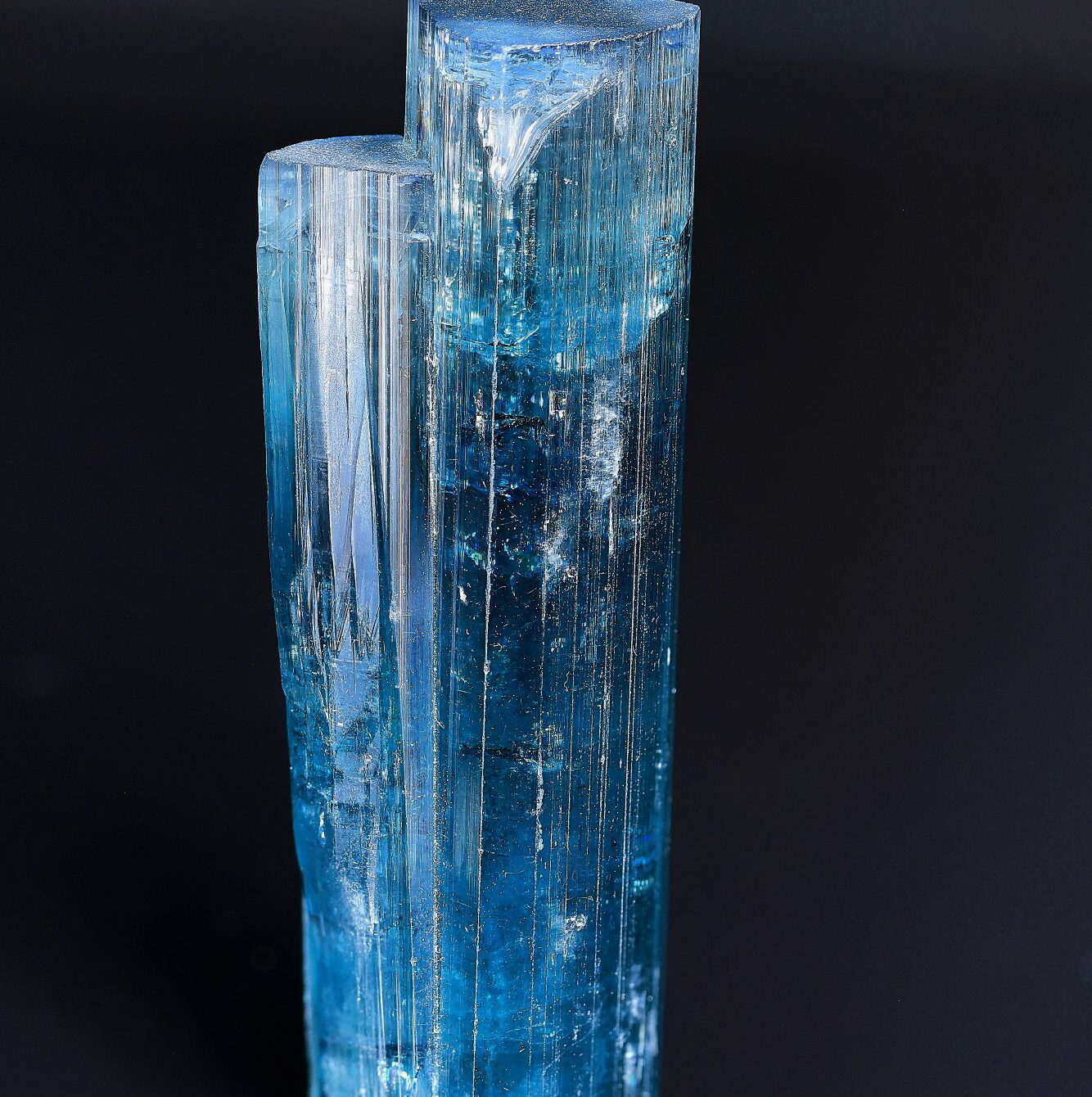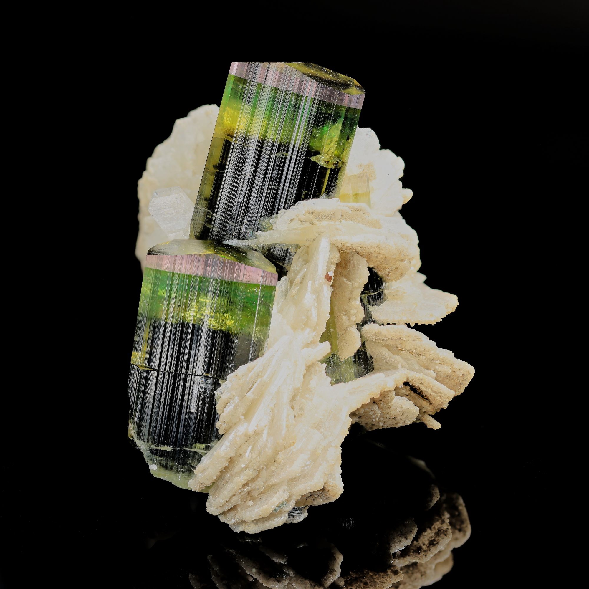 Excellent group of two multi-colored and gemmy Tourmaline crystals sitting in between a group of whiteish Albite crystals from Stak Nala, Baltistan, Pakistan. Most of the Tourmaline crystals from Stak Nala are a little bit dull and mostly not really gemmy. But these two crystals are. This miniature specimen is a real eye catcher.